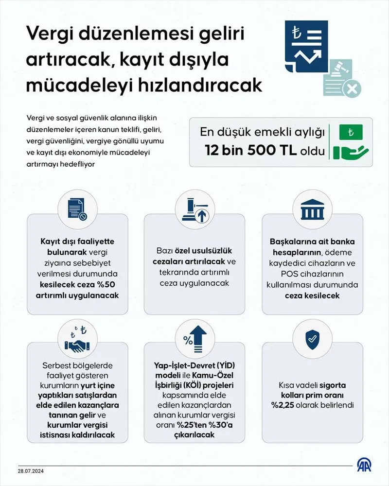 Kanun, geliri, vergi güvenliğini, vergiye gönüllü uyumu ve kayıt dışı ekonomiyle mücadeleyi artırmayı hedefliyor. Bu çerçevede vergi dairesinin bilgisi dışında mükellefiyet tesis ettirmeksizin kayıt dışı faaliyette bulunmak suretiyle vergi ziyaına sebebiyet verilmesi durumunda kesilecek vergi ziyaı cezası yüzde 50 artırımlı uygulanacak.