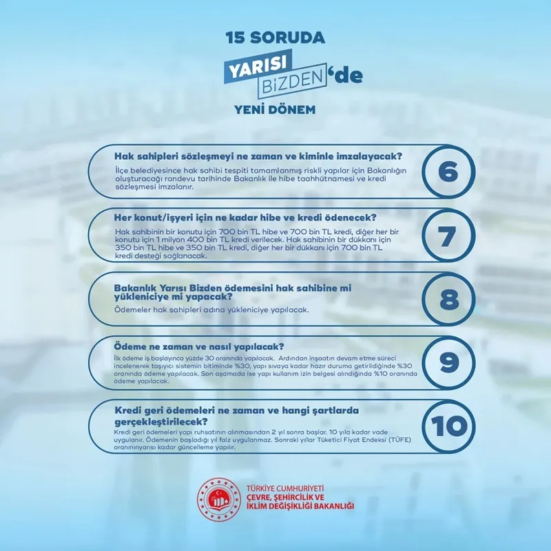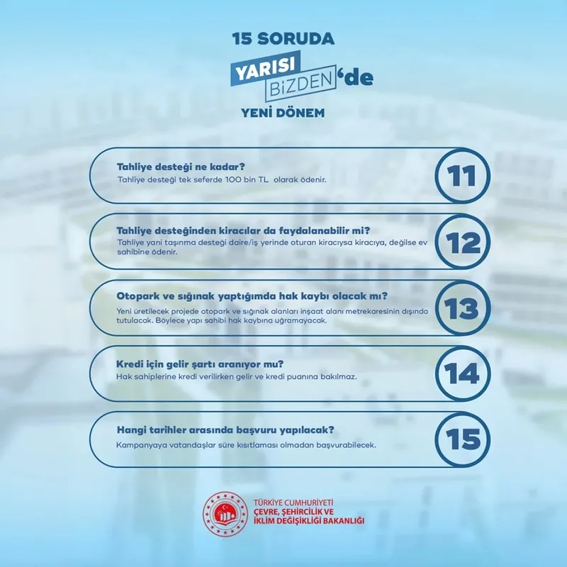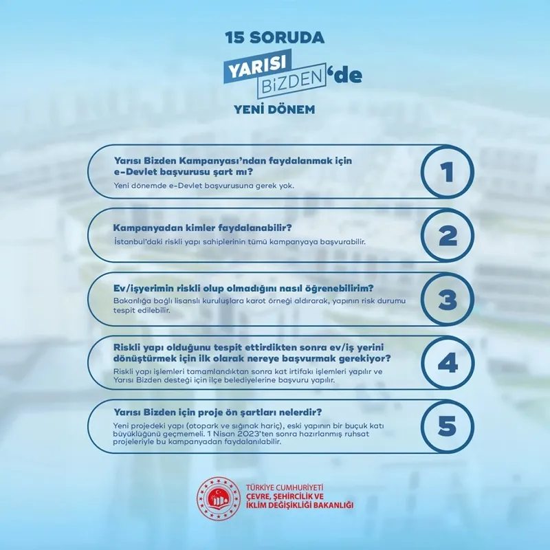 Bakan Kurum, sosyal medya hesabından yaptığı paylaşımla yeni döneme ilişkin ayrıntıları açıkladı. Vatandaşların merak ettiği sorulara yanıt veren bilgilerin bulunduğu paylaşımda sürecin detayları yer aldı. Bakan Kurum paylaşımında, "Her bir vatandaşımızı sağlıksız konutlardan çıkarana kadar bize durmak yok. İstanbul'da Yarısı Bizden'de yeni dönemi başlattık. İşte merak ettiğiniz soruların yanıtları" ifadesini kullandı.