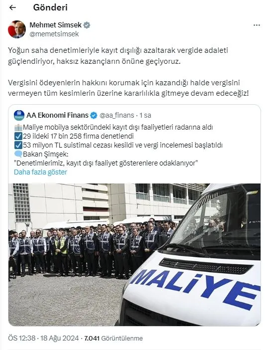 Şimşek, "Yoğun saha denetimleriyle kayıt dışılığı azaltarak vergide adaleti güçlendiriyor, haksız kazançların önüne geçiyoruz. Vergisini ödeyenlerin hakkını korumak için kazandığı halde vergisini vermeyen tüm kesimlerin üzerine kararlılıkla gitmeye devam edeceğiz!" ifadelerini kullandı.