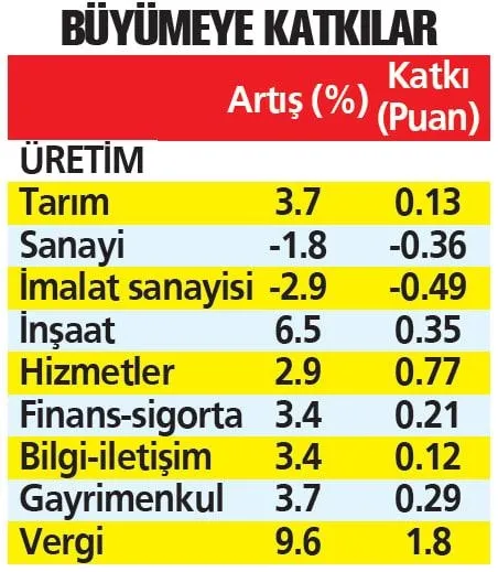 TÜİK'in üretim yöntemiyle milli gelir hesabına göre tarım sektörü büyümeye 0.13 puan katkı verdi. Deprem bölgesindeki yenileme çalışmalarının da etkisiyle yüzde 6.5 büyüyen inşaat sektörünün büyümeye katkısı 0.35 puan oldu. Gayrimenkul sektörü yüzde 3.7 büyürken, ekonomiye 0.29 puan katkı verdi.