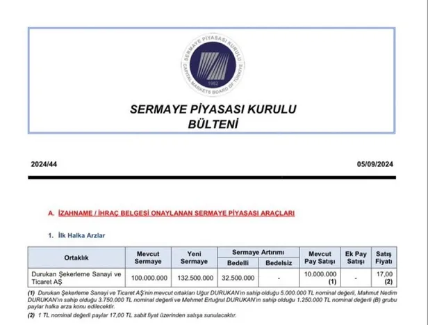 Halka arzda 1 TL nominal değerli payların her biri, 17 TL sabit fiyattan satılacak. Bu da toplamda 32.500.000 TL bedelli sermaye artışı ile Durukan Şekerleme'nin sermayesinin 100.000.000 TL'den 132.500.000 TL'ye çıkarılacağı anlamına geliyor.