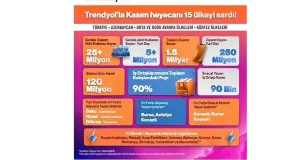 Trendyol kasım kampanyalarını bu yıl ilk kez eş zamanlı olarak 15 ülkede yaptı. Şirketten yapılan açıklamaya göre,kasım kampanyası sırasında 25 milyon günlük aktif kullanıcı sayısına ulaşan Trendyol'un, kampanya süresince e-ihracat yapan satıcı sayısı 90 bine ulaştı. Trendyol Kasım ayı boyunca 250 milyon kez yurt dışı müşterilerden ziyaret aldı. Trendyol bu dönemde 10 ülkede de en çok indirilen uygulama olduğu açıklandı. Türkiye'de en çok alışveriş yapılan iller Bursa, Antalya ve Kocaeli olurken yurtdışı pazarlarla ise en yüksek talep Bakü, Riyad ve Bükreş'ten geldi.