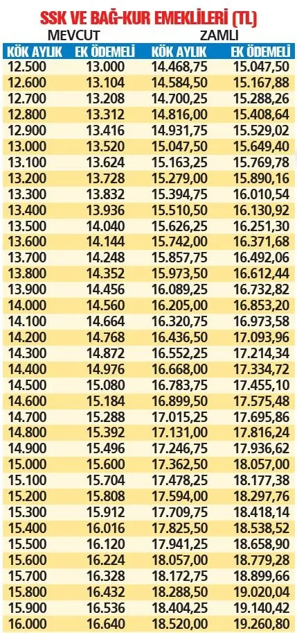 Bu zam oranı Ocak ödeme dönemi itibariyle gelirlere yansıtılacak. Eğer refah payı gibi bir düzenleme olursa, zam oranı daha da yükselecek. Yüzde 11.54 zamla en düşük emekli aylığı memurlarda 17 bin 588 liradan 19 bin 617 liraya çıkarken, SSK ve Bağ-Kur'lularda 12 bin 500 lira olan taban tutarın da artırılması bekleniyor.