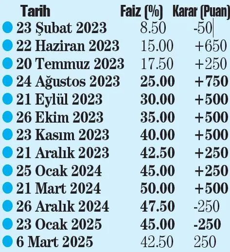 Aralık ve Ocak aylarında 250'şer baz puanlık indirimle politika faizini yüzde 50'den 45'e indiren Türkiye Cumhuriyet Merkez Bankası, dün de 'indirime devam' dedi. Merkez Bankası Başkanı Fatih Karahan başkanlığında toplanan Para Politikası Kurulu (PPK), bu yılın ikinci toplantısında politika faizi olan bir hafta vadeli repo ihale faiz oranını 250 baz puan indirerek yüzde 45'ten 42.5'e düşürdü.