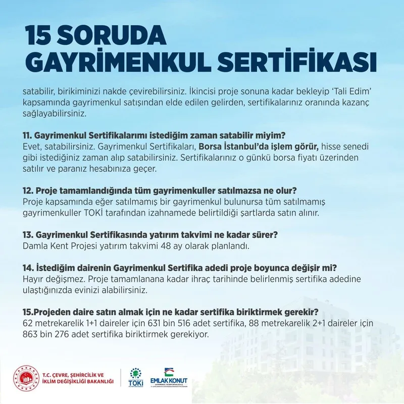 Gayrimenkul sertifikaları Çevre, Şehircilik ve İklim Değişikliği Bakanlığı'na bağlı TOKİ ve Emlak Konut güvencesindedir.