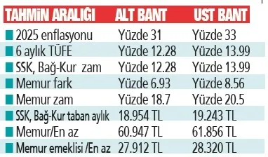 Milyonlar zam oranlarını Ocak ayı başında öğrenecek. Emekliler için taban aylık artışı ve refah payı gibi kararlar da bu tarihten sonra verilecek. Bu kapsamda SSK ve Bağ-Kur emeklilerinde taban aylığa 6 aylık enflasyon artışı bekleniyor. Bu uygulama yapılırsa, halen 16 bin 881 lira olan en düşük ödemenin, 5 aylık orana 18 bin 772 liraya çıkacağı görülürken, Aralık verisiyle bu tutar daha da yükselecek.