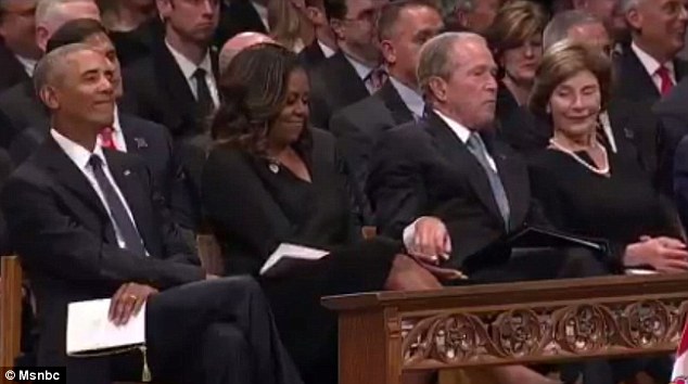 Cenaze töreninde yapılan konuşmalar sırasında TV'lere yansıyan bir görüntü sosyal medyada gündem oldu. Konuşmalar sırasında ön sırada oturan Obamalar ve Bushlar'a yakın çekim yapan kameralar ilginç bir ana tanıklık etti.