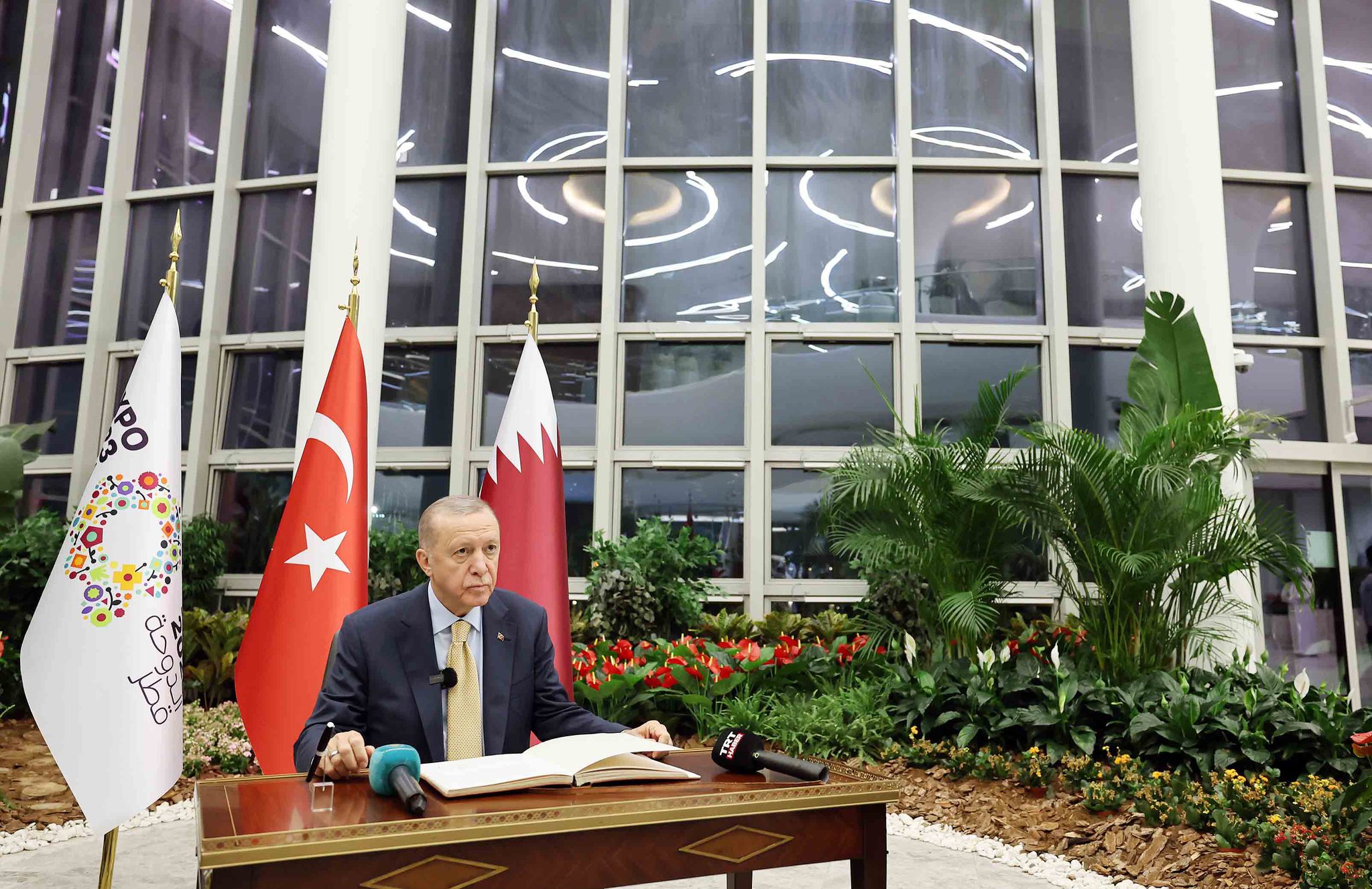 Lusail Sarayı'nda Katar Emiri Şeyh Temim bin Hamad Al Sani ile görüşen ve Türkiye-Katar Yüksek Stratejik Komite 9. Toplantısı'na katılan Erdoğan, buradaki temaslarının ardından EXPO 2023 fuar alanına geçti.