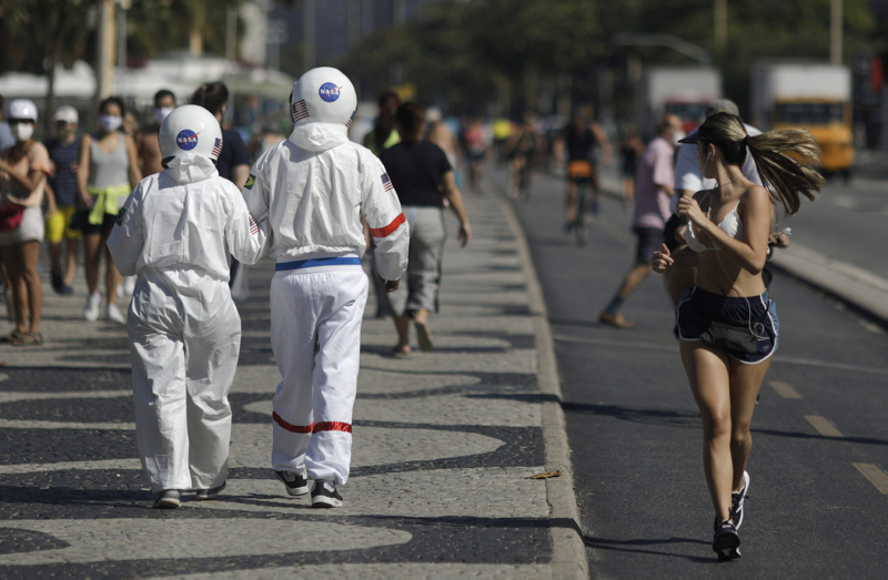 Reuters'ın objektifine yakalanan iki kişi Brezilya'nın ünlü sahilinde astronot kıyafetleriyle dolaştı. Meraklı bakışlara aldırmadan yürüyen ikili ilgi odağı oldu.