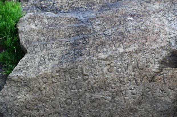 Kayaların üzerine 20 satırlık metin, iki tarih ve bir geminin çizimleri yer alıyordu.
