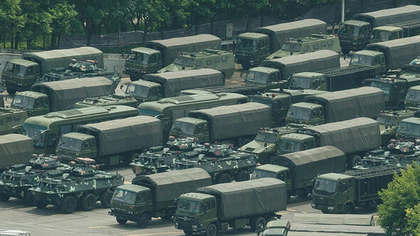 Çin ordusuna mensup binlerce asker ve yüzlerce zırhlı araç, Hong Kong sınırında yer alan Shenzhen kentinde geçit töreni düzenledi.