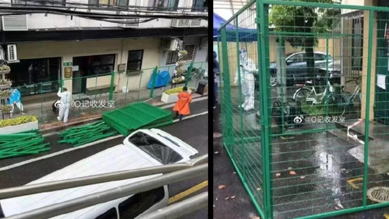 Koronavirüs vakalarındaki artış sebebiyle uzun süredir karantinada olan Çin'in finans merkezi Şanghay'da sıkı kısıtlamalara halkın tepkisi sürerken yetkililer konut binalarının dışına metal bariyerler çekerek insanları adeta kafese aldı.