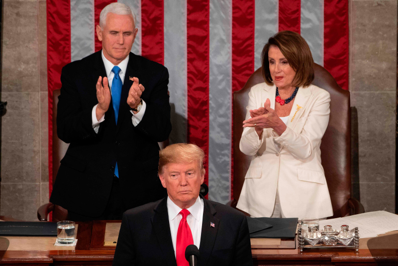 29 Ocak'ta yapılması planlanan, ancak federal hükümetin kapalı olması sebebiyle 5 Şubat gününe ertelenen konuşmanın yapıldığı oturuma, ABD Başkan Yardımcısı Mike Pence ve Temsilciler Meclisinin Demokrat Başkanı Nancy Pelosi başkanlık etti.