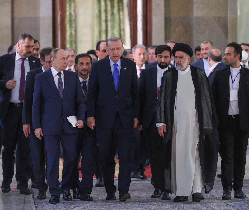 Başkan Recep Tayyip Erdoğan, İran Cumhurbaşkanı İbrahim Reisi ve Rusya Devlet Başkanı Vladimir Putin İran'ın başkenti Tahran'da "Astana Formatında Yedinci Üçlü Zirve Toplantısı"nda bir araya geldi.