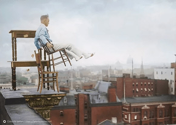 John Reynolds isimli bu akrobat, Washington D.C'de Lansburgh mobilya şirketi binasının tepesinde fotoğraflanmış. Bu tür şovları yapmadan önce binaya örümcek adam gibi tırmanan şovmen kimi zaman 1.500 kişilik seyirci kitlesine ulaşabiliyordu.