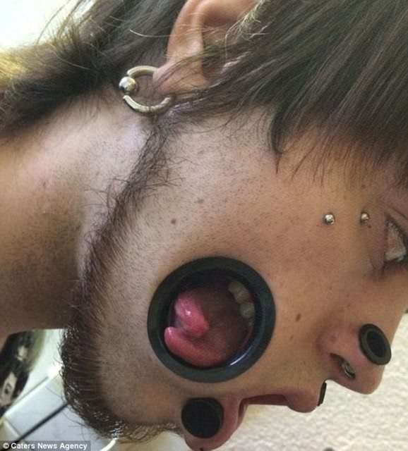 2014 yılında yüzüne inanılmaz piercingler taktıran bu genç adamın yanaklarında 24 mm ölçüsünde delikler var.