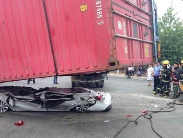 Qingdao yakınlarındaki otoyolda meydana gelen kaza yaklaşık 100 ton ağırlığındaki konteynerin altında kalan otomobil ezilerek adeta kağıt gibi oldu.