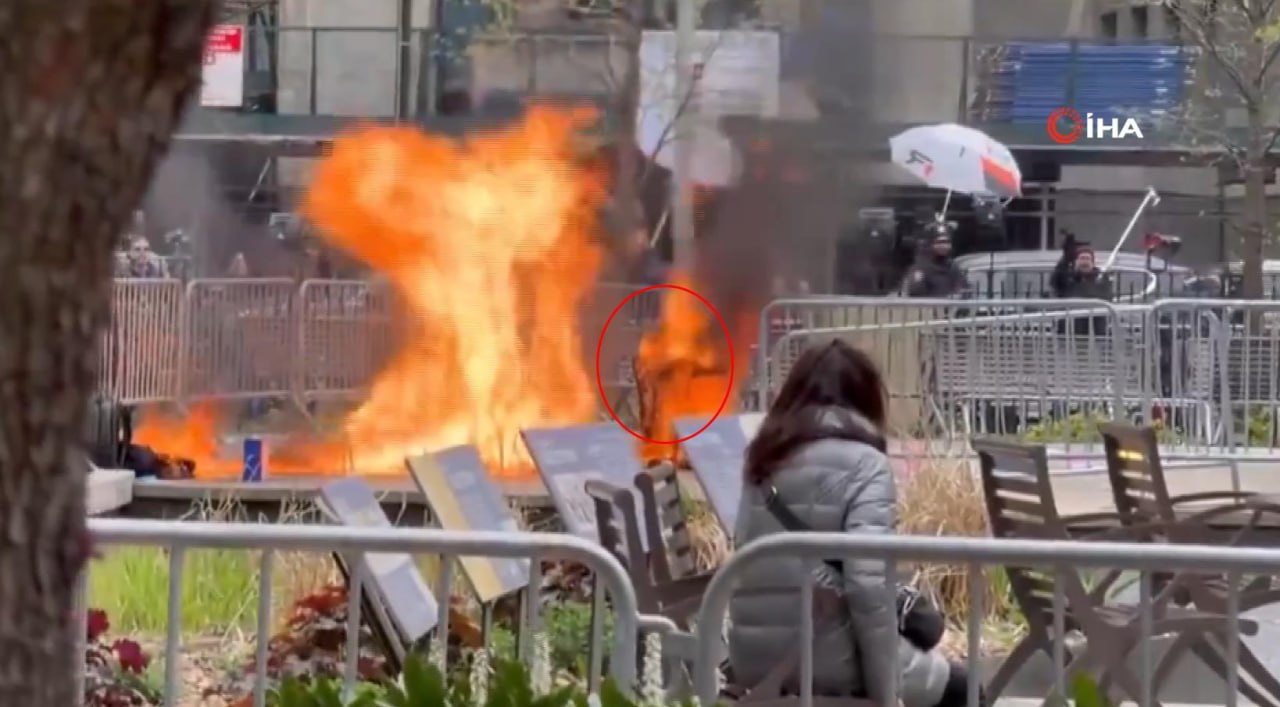 Trump'ın yargılandığı davada dün 12 jüri üyesinin belirlenmesinden dakikalar sonra bir kişi polis tarafından çevrilen alana yaklaşarak mahkemenin önüne geldi.