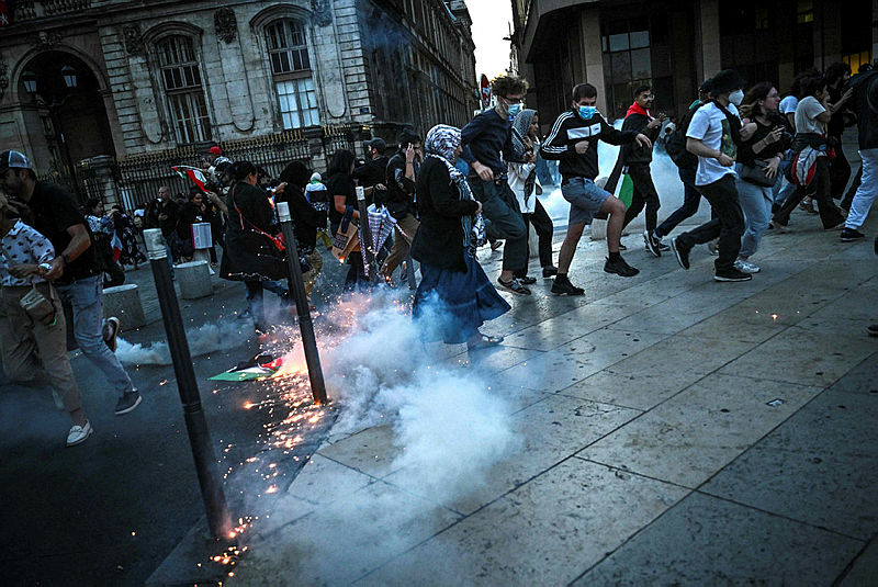Sosyal medyaya yansıyan görüntülerde, göstericilerin "Katil İsrail, Macron suç ortağı" sloganları attığı duyulurken, polisin göstericileri dağıtmak için biber gazıyla müdahale ettiği görülüyor.
