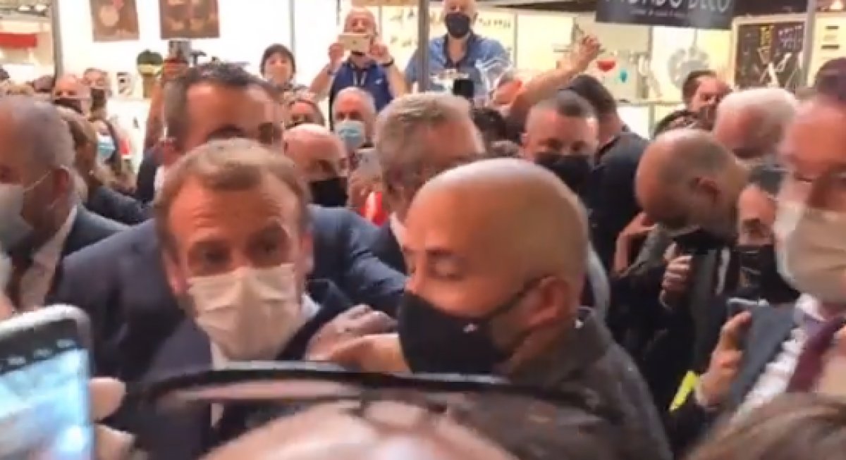 Sosyal medyada paylaşılan görüntülerde, Lyon'da otelcilik ve restoran sektörüne yönelik uluslararası fuarı ziyaret eden Macron'a, etrafında korumalar ve fuar katılımcılarının olduğu sırada yumurta fırlatıldı.