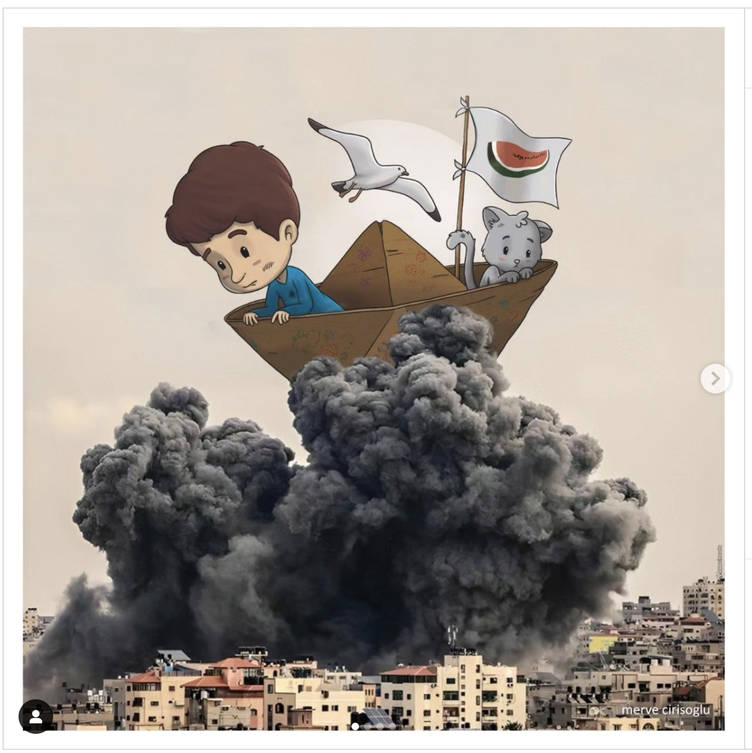 İyilikhane Çocuk Derneğinin Instagram hesabında paylaşılan Merve Çirişoğlu'nun çizdiği illüstrasyonda kağıttan bir gemide bombalanan Filistin'i izleyen çocuk, kedi ve kuş ile Filistin bayrağını temsil eden karpuz dilimi görseli yer aldı.