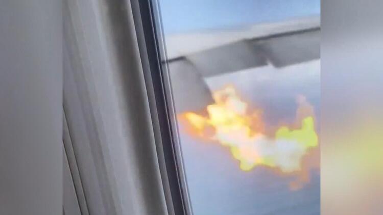 Yolculardan birinin kamerasınca kaydedilen görüntülerde, uçağın motorundan ateş çıktığı görüldü.