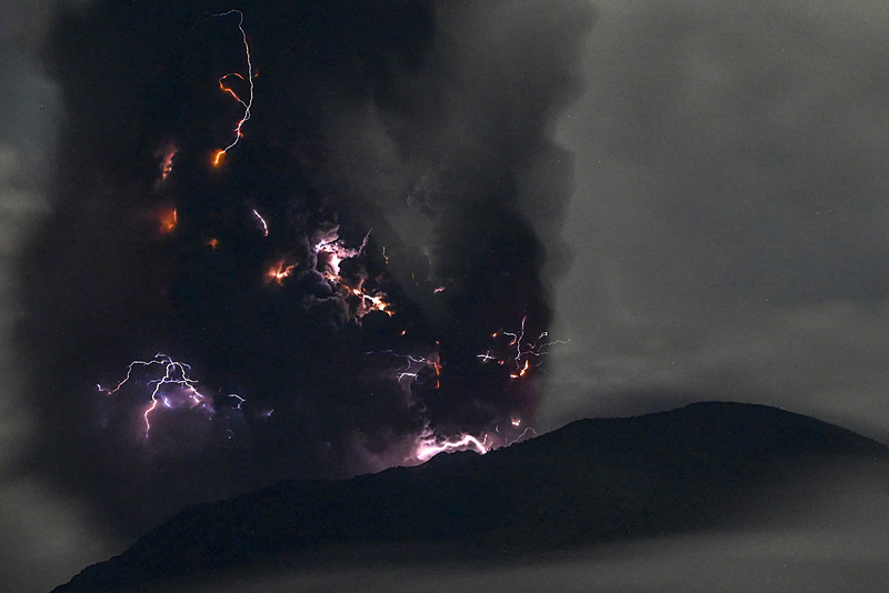 Endonezya'da Kuzey Maluku eyaletindeki Ibu Yanardağı'da patlama meydana geldi. Gökyüzü gri kül bulutları ile kaplanırken yanardağ kraterinin etrafında mor şimşekler çaktı.
