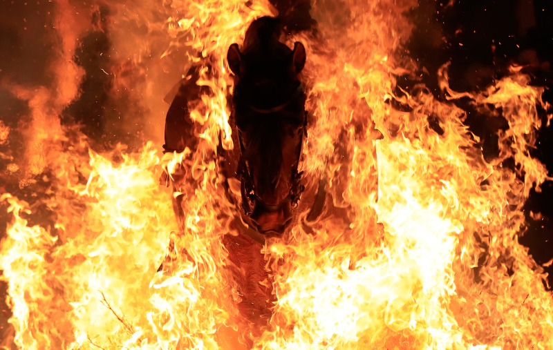 Başkenti Madrid'in 100 kilometre kuzeydoğusundaki San Bartolome de Pinares kasabasında atların ateş üzerinde yürütülmesi geleneği bu yıl da renkli geçti.