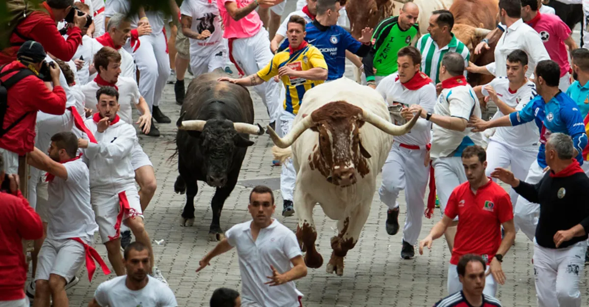 Beyaz kıyafetler giyen ve geleneksel olarak kırmızı bir fular takan koşucular salınan boğaların önünde koşacaklar