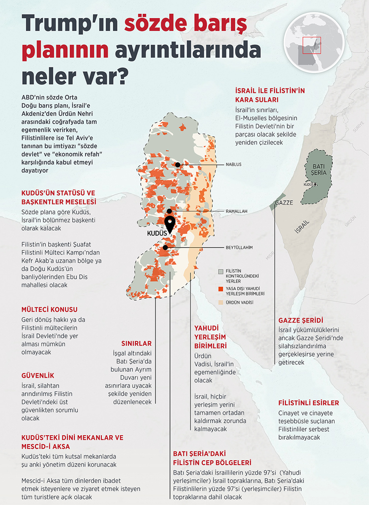 AA muhabirleri, ABD Başkanı Donald Trump'ın salı günü açıkladığı ve "Yüzyılın Anlaşması" olarak isimlendirilen sözde barış planının ayrıntılarını derledi. İşte başlıklar halinde ABD'nin sözde barış planı: