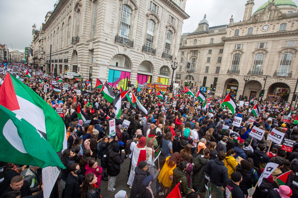 İngiltere'nin başkenti Londra'da Filistin'le dayanışma gösterisi için toplanan on binlerce kişi, polisin yoğun güvenlik önlemleri altında üçüncü kez yürüdü.