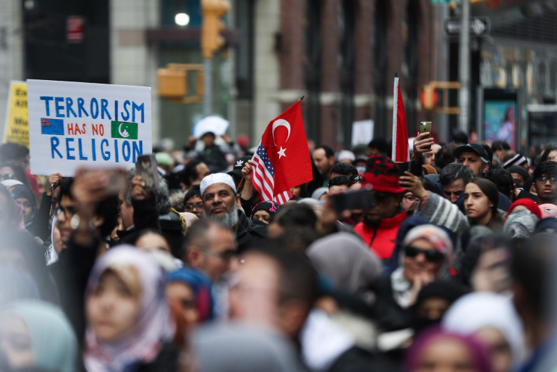 New York'ta Times Meydanında toplanan Müslüman, Hristiyan ve Yahudi toplumundan göstericiler, İslamofobi karşıtı protesto düzenledi.