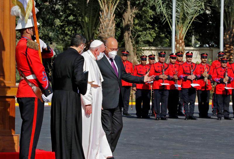 Papa, daha sonra Cumhurbaşkanlığı Sarayı'na geldi. Papa Francis, Cumhurbaşkanlığı Sarayı'nda Irak Cumhurbaşkanı Berhem Salih tarafından resmi törenle karşılandı.