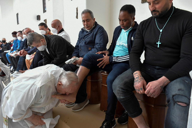 Ayin sırasında objektiflere yansıyan anlarda Papa, burada 12 mahkumun ayaklarını yıkayıp öptü.