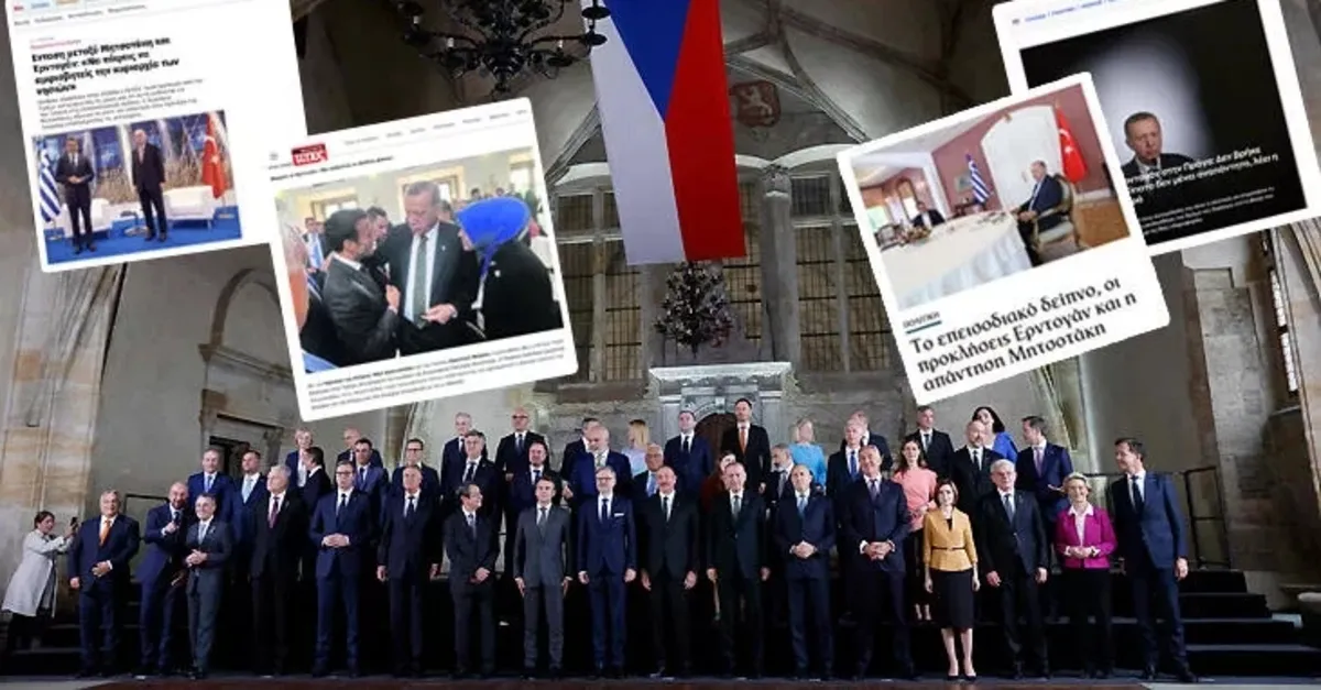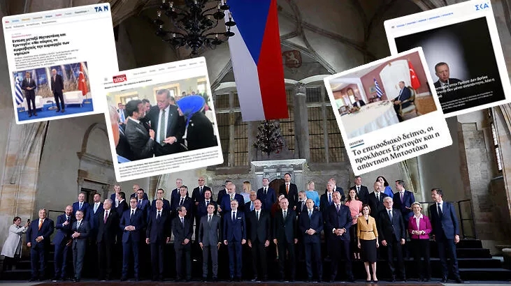 İlk kez toplanan Avrupa Siyasi Topluluğu zirvesine Türkiye ve Yunanistan tarafından yapılan açıklamalar damgasını vurdu. 'Aynı şehirde iki yabancı' başlıklarıyla Başkan Recep Tayyip Erdoğan ve Yunanistan Başbakanı Kiryakos Miçotakis'in Prag'a gideceğini duyuran Yunan medyasında, bugün de tüm manşetler zirveye ayrıldı.
