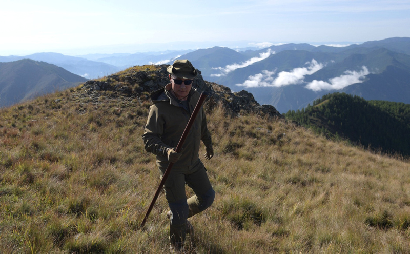 Putin ve Şoygu ormanlık alanların bazı kısımlarında arazi aracıyla gezip Putin dağların zirvesine çıktıktan sonra göl ve doğa manzarasını izledi.