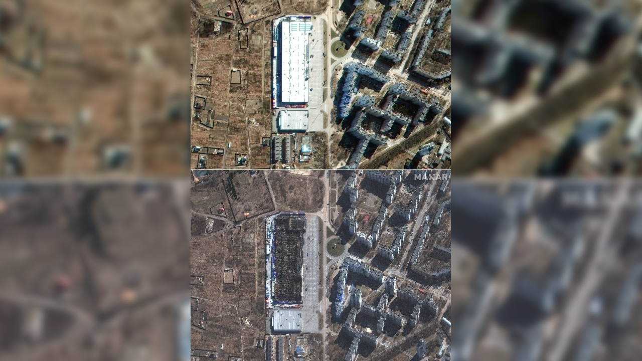 Çernihiv`de Rusya`nın hedef aldığı alışveriş merkezi Epicenter K`nin uydu görüntüleriyle öncesi ve sonrası.