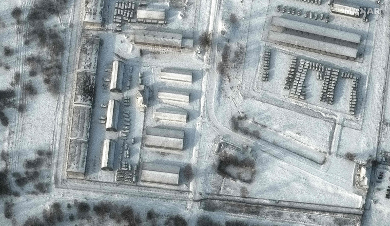 Her geçen gün tansiyonun yükseldiği bölgede, sınır hattına yakın yerlere Rusya`nın konuşlandırdığı askeri malzemeler uydudan görüntülendi. (Rusya-Ukrayna sınırına 13 kilometre mesafedeki tesiste yer alan zırhlı personel taşıyıcılar ve kamyonlar. Klimovo, Bryansk Oblastı.)