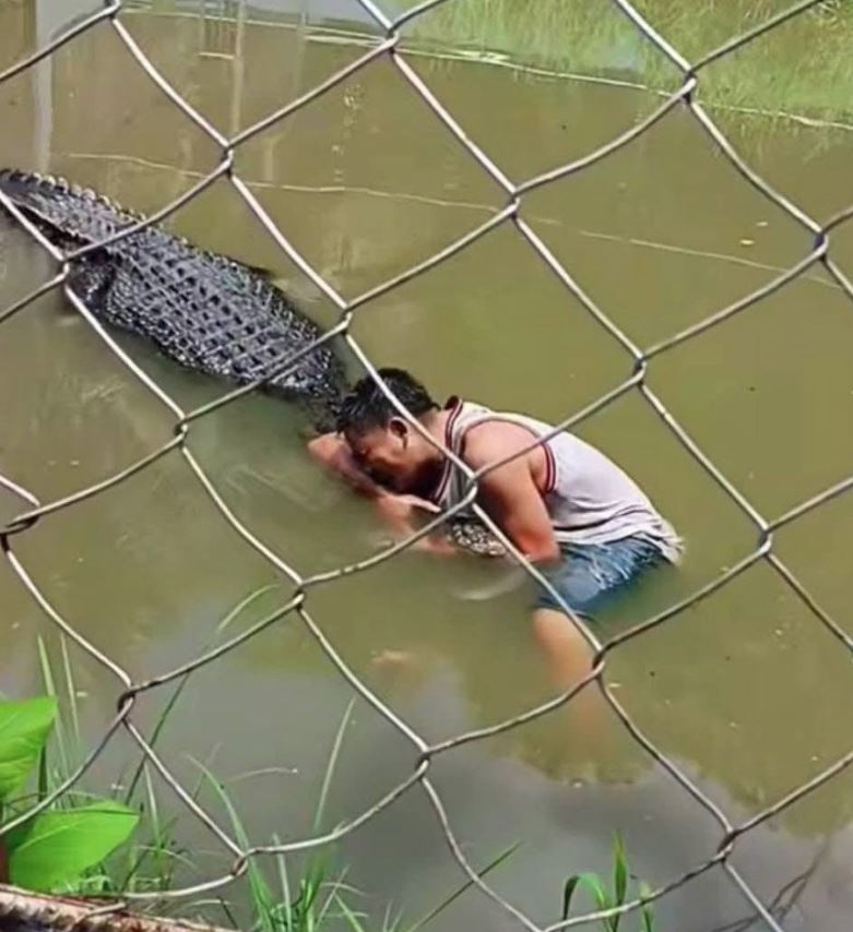 Timsahla selfie çekmek için dikenli tellerin üzerinden atlayan turist, gülümseyerek telefonunu çıkardıktan saniyeler sonra şoka girdi.