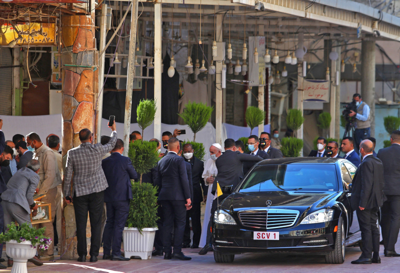 Irak resmi haber ajansına göre, Papa'nın bulunduğu araç konvoyu Necef Havalimanı'ndan Sistani'nin evine geçti. Papa ile Sistani görüşmesi dini mercinin evinde başladı.
