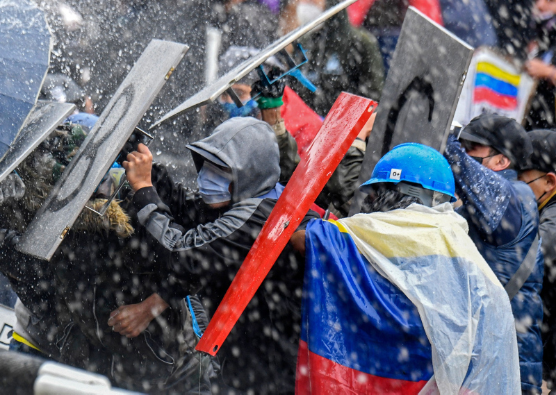 Göstericilerden bazı grupların Ulusal Kongre Binası'na taşlı saldırıda bulunması üzerine Kolombiya toplumsal olaylara müdahale birimi ESMAD mensubu polisler, göstericilere göz yaşartıcı gaz ve su sıkarak müdahale etti.