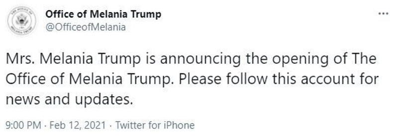 Melania Trump'ın sosyal medya platformu Twitter'dan '@OfficeofMelania' hesabını açtığını duyurdu. Trump mesajında "Bayan Melania Trump, Melania Trump Ofisi'nin açılışını duyuruyor.