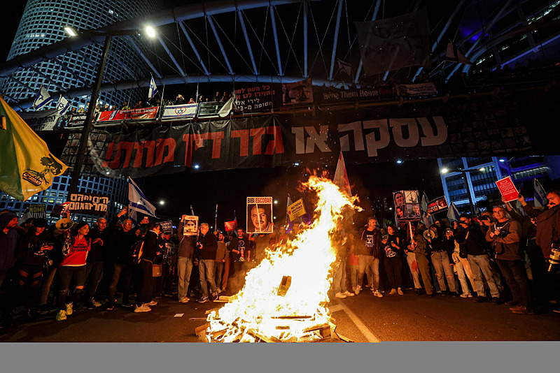 Yeniden seçim düzenlenmesi ve Hamas ile rehine anlaşması yapılmasını isteyen İsrailli protestocular yolları kapattı ve polisle karşı karşıya geldi.