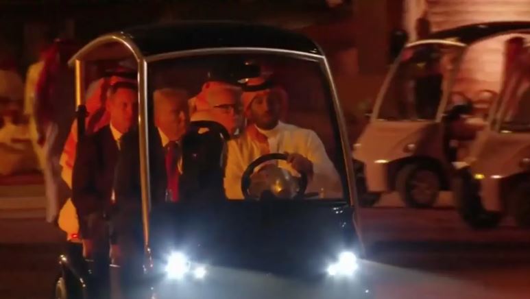 Riyad'da Trump'ı mor halılarla karşılayan Selman, akşam ise golf arabasıyla yemeğe götürdü. 78 yaşındaki Trump, Riyad'ın dışında bulunan Suudi kraliyet ailesinin 18. yüzyıldan kalma tarihi şehrinde geleneksel bir karşılama töreni sırasında Suudi Arabistan'ın fiili yöneticisi olan 39 yaşındaki Muhammed bin Salman'ın sürdüğü arabaya bindi.
