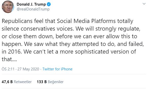 Sosyal paylaşım sitesi Twitter, ABD Başkanı Donald Trump'ın Minneapolis kentinde siyahi Amerikalı George Floyd'un polis tarafından gözaltına alınırken öldürülmesinin ardından yaşanan protestolarla ilgili paylaşımına uyarı notu koydu