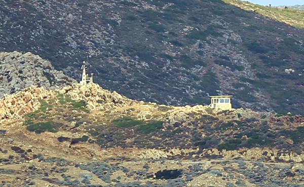 Uluslararası antlaşmalara göre, Onikiadalar'ın hukuki statüsü dışında bırakılan, yerleşime kapalı ve silahsız olması gereken Keçi Adası'na çizilen Yunan bayrağı da dikkati çekiyor. Bayrağın her iki yanında, üstleri kamufle edilen siperlerdeki topçu bataryaları rahatlıkla görülüyor.
