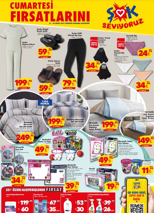 ŞOK 1 - 4 Nisan 2023 aktüel ürünler kataloğu yayımlandı. Bu hafta ŞOK marketlerinde Loreal Kolajen Bakımı Krem • 5 60 TL'ye, Duru Duş Jeli 35 TL'ye, Dove Sıvı Sabun 30 TL'ye, Cif Power&Shine Banyo/Mutfak 26 TL'ye, Tat Ketçap 34 TL'ye, Finish Bulaşık Makine Temizleyicisi 30 TL'ye, Vanish Oxi Leke Çıkar 45 TL'ye satılıyor. İşte ŞOK 1 - 4 Nisan 2023 aktüel ürünler kataloğu tam liste.