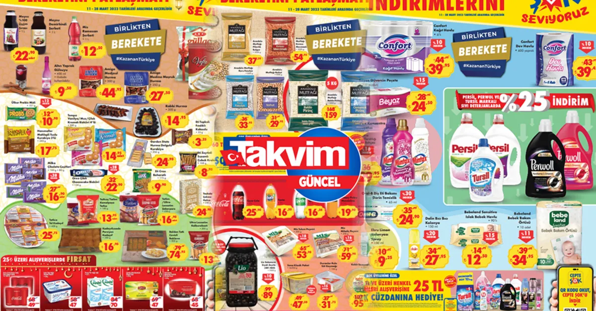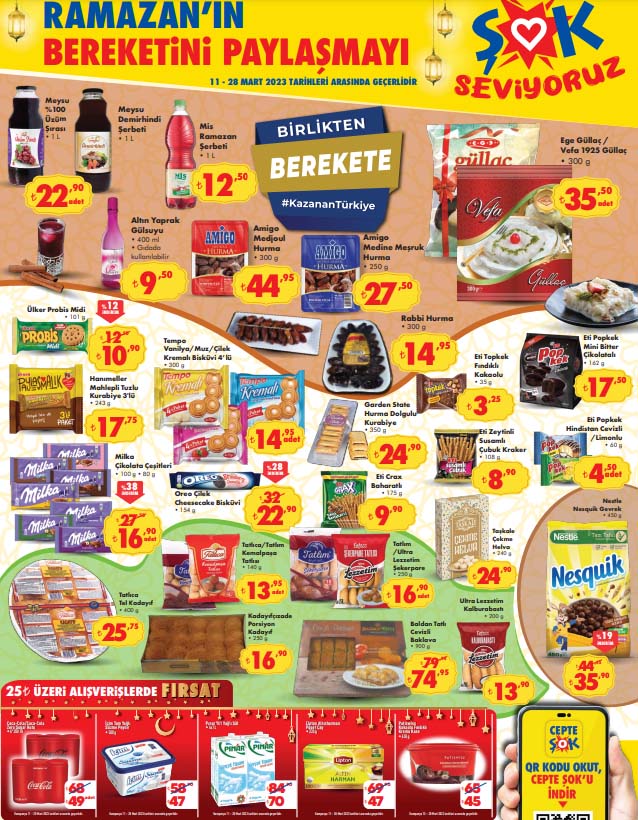 Ramazan şerbeti, güllaç, baklava, gülsuyu, kalburabastı, şekerpare ve hurma çeşitlerinde indirim bugün başladı. Ramazan ayı için artık sayılı günler kaldı. Mübarek üç aylar içerisinde yer alan Recep, Şaban aylarından sonra gelen Ramazan ayı, içerisinde yer alan oruç ibadeti nedeniyle ayrı bir öneme sahiptir. Zincir marketleri de Ramazan ayı için özel aktüel ürünler kataloğu yayımlandı. Peki bu hafta ŞOK'ta neler var? İşte ŞOK 16-28 Mart 2023 indirimleri.