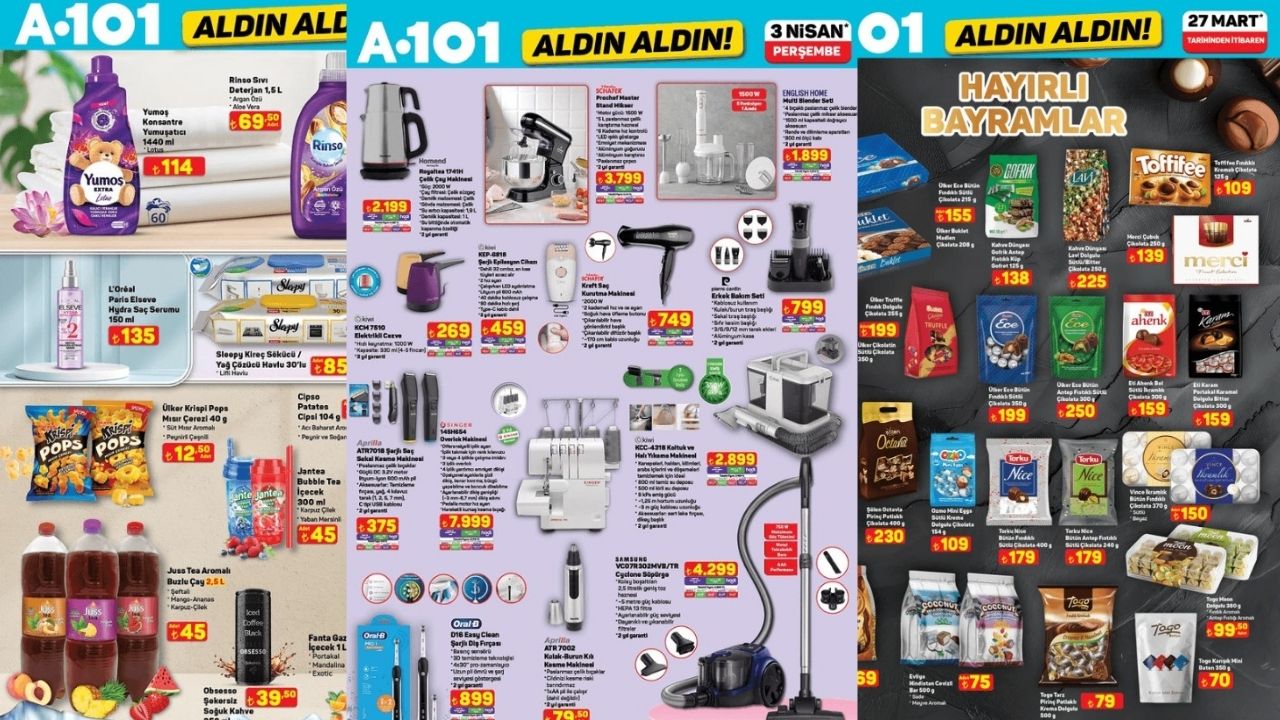 A101 3 Nisan Perşembe günü geçerli olacak yeni aktüel ürünler kataloğunu açıkladı. 27 Mart - 4 Nisan tarihleri arasında geçerli kampanyalarda yok yok! Elektrikli ev aletlerinden mutfak yardımcılarına, kişisel bakım ürünlerinden temel gıda maddelerine kadar birçok kalem ürün avantajlı fiyatlarla A101 mağazalarında ve online satışta olacak.