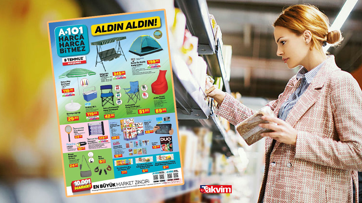A101 8 Temmuz aktüel kataloğunda dikkat çeken kampanyalı ürünler arasında; Toshiba 58UA2063DT 58" Ultra HD Android Smart Led Tv, Epson L3150 Ecotank Yazıcı, Axen AX58LEDJ203 Ultra HD Android Smart Led Tv, HI-LEVEL HL49FAL27 49" Full HD Android Smart Led Tv, SEG SBM 4001 / BM 4001 4 Programlı Bulaşık Makinesi, SEG SCM 9100 / CM 910 Çamaşır Makinesi, Samsung VC07R302MVR/TR Cyclone Süpürge, Flavel FLV200 Türk Kahvesi Makinesi, Arzum AR1133 Choppy Doğrayıcı, Xiaomi Band 5 Akıllı Bileklik ürünleri yer alıyor.
